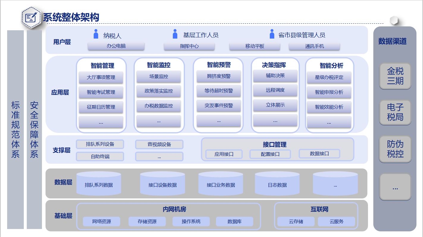 利用人工智能、大数据等技术,为纳税人员提供精准、人性化服务,并通过智能的数据分析为办税服务厅进行星级评定,提升办税服务厅整体服务能力和服务水平。依托智能平台辅助决策优势,优化资源配置和业务流程,最终实现纳税服务高效、便捷。