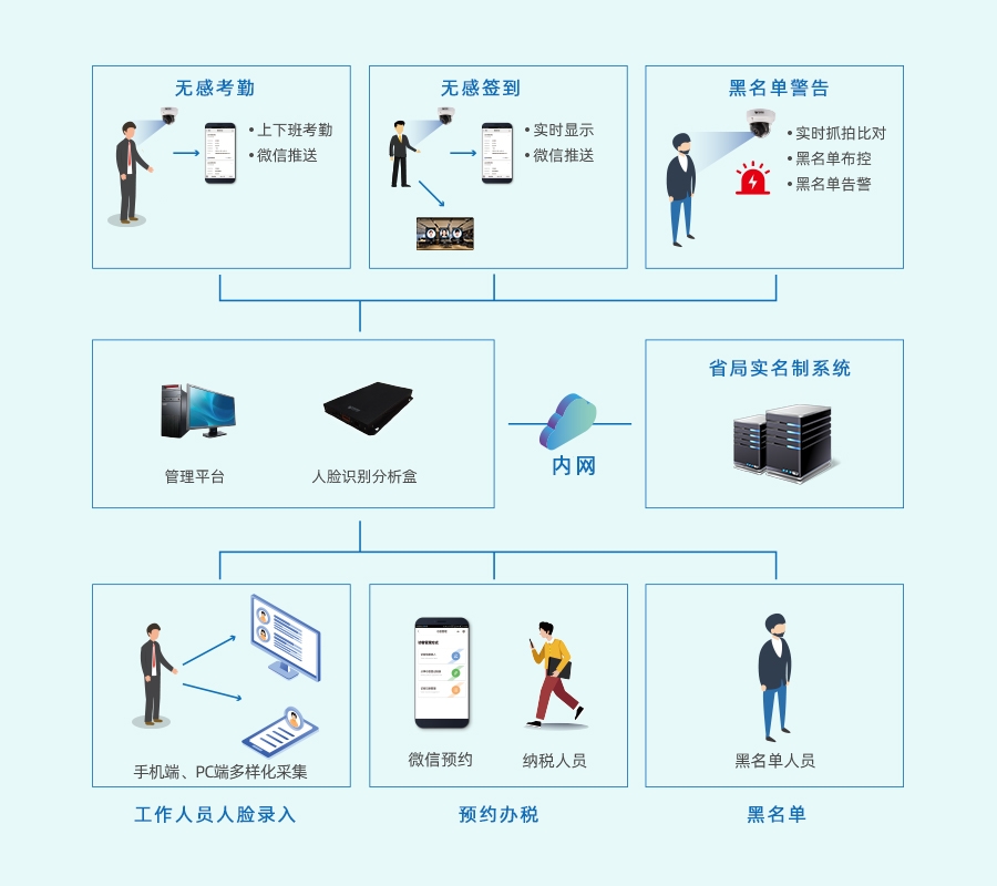 基于非配合式人脸识别、深度机器学习等最新AI技术,采取具有着完全自主专利权的人脸侦测算法、人脸跟踪算法、人脸抓拍算法及人脸识别算法,实现了动态人脸对比签到,静态人脸照片搜索等功能。应用在税务服务厅中,既能全面落实办税实名制要求,又无需让纳税人做二次操作,增强纳税人的科技体验。免去以往排队取号的繁杂,签到后自主生成排号,真正实现网办预约业务的有效性和先进性。